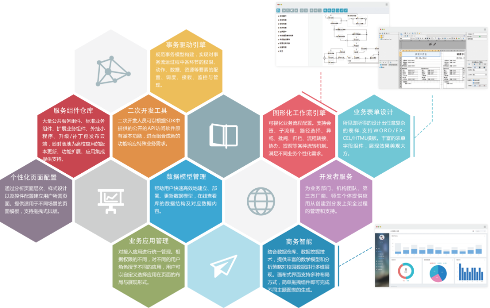 提供标准化服务、组件和管理工具,支撑学校办公管理与服务、教学管理与服务、学生管理与服务、科研管理与服务建设,协助学校信息技术人员进行业务功能二次开发,减少对开发公司的技术依赖。